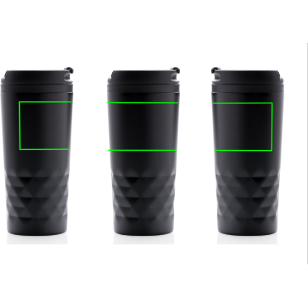 Модный стакан из нержавеющей стали с геометрическими деталями. Внутренний корпус изготовлен из пластика. Мыть только вручную. Объем 300 мл.