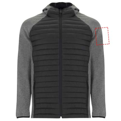 Мужская куртка из двух комбинированных тканей. Несъемный регулируемый капюшон. Рукава реглан. Рукава, боковые вставки и капюшон из ткани софтшелл. Стеганая ткань с наполнителем с эффектом пера спереди и сзади. Обратная молния в тон с бегунком и защитой для подбородка. Два кармана спереди с молнией. Воротник, манжеты и низ с эластичной окантовкой в тон. Съемная этикетка. Ветрозащитная модель.