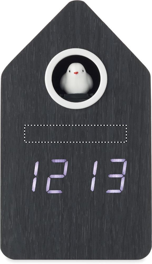 MDF cuckoo clock including a built-in alarm / temperature display. Bird will come out every full hour and during alarm and it has bird cuckoo voice. White LED display. Sound is automatically silenced between 22.00h to 06.00. 5 mins snooze intervals.