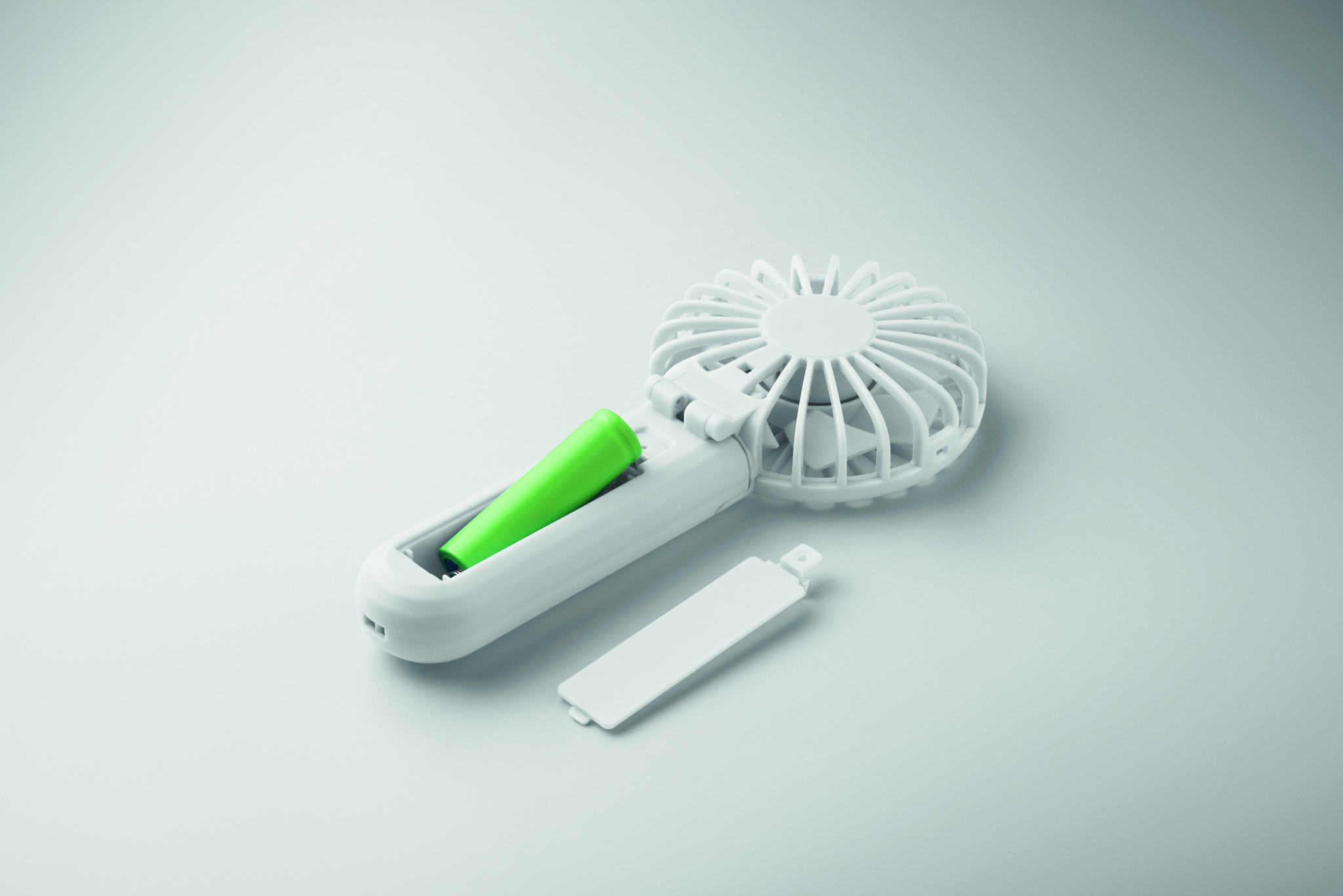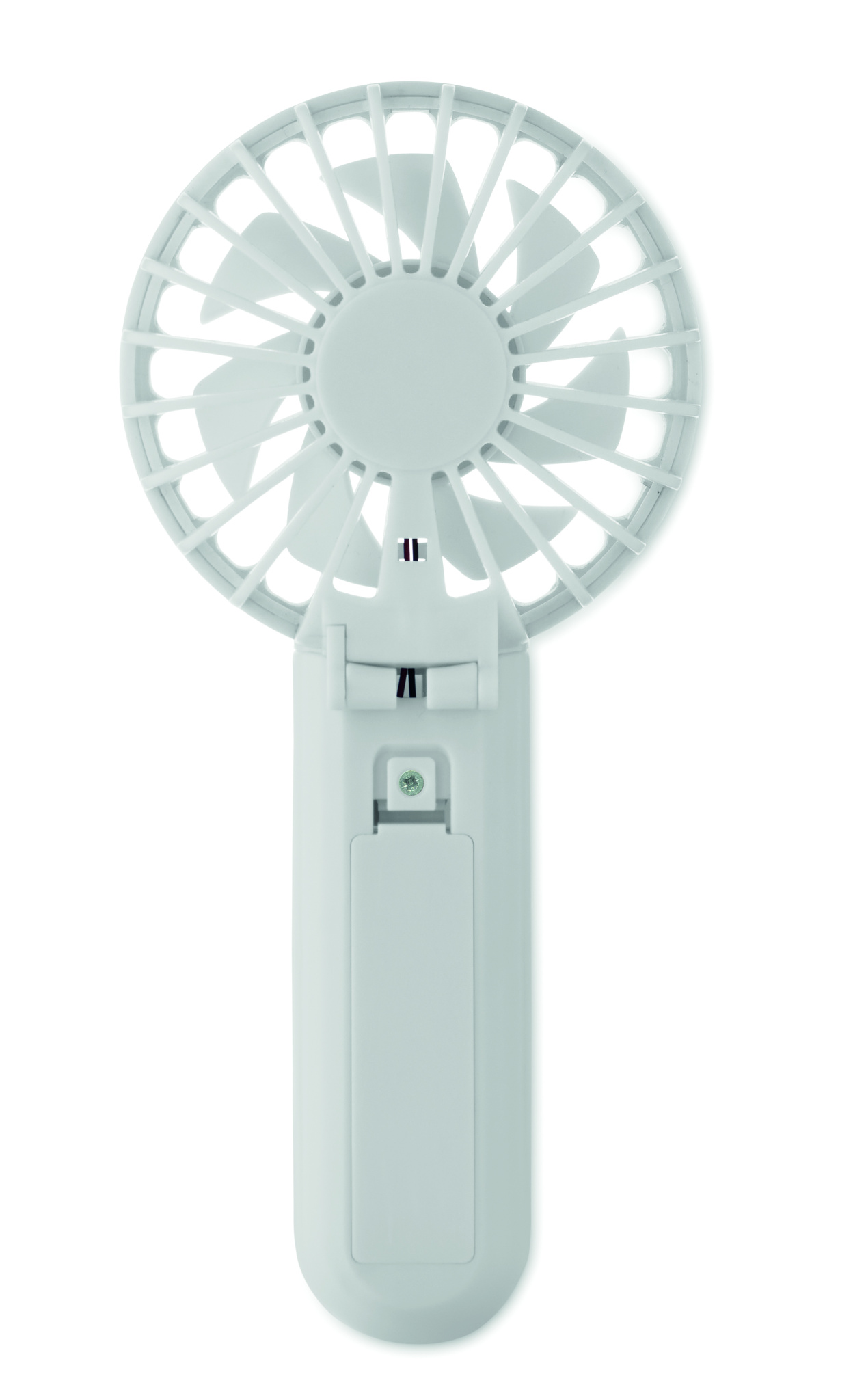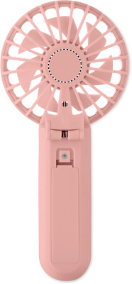 Portable foldable fan in ABS with 3 speed settings. Can be used as handheld or desk fan. Includes 1 replaceable and rechargeable 14500 Lithium battery 500 mAh.