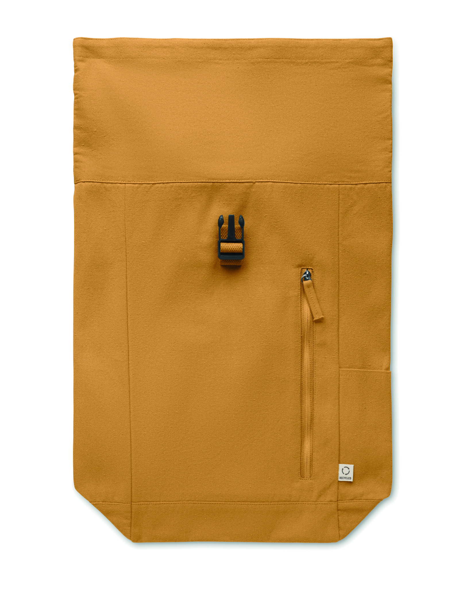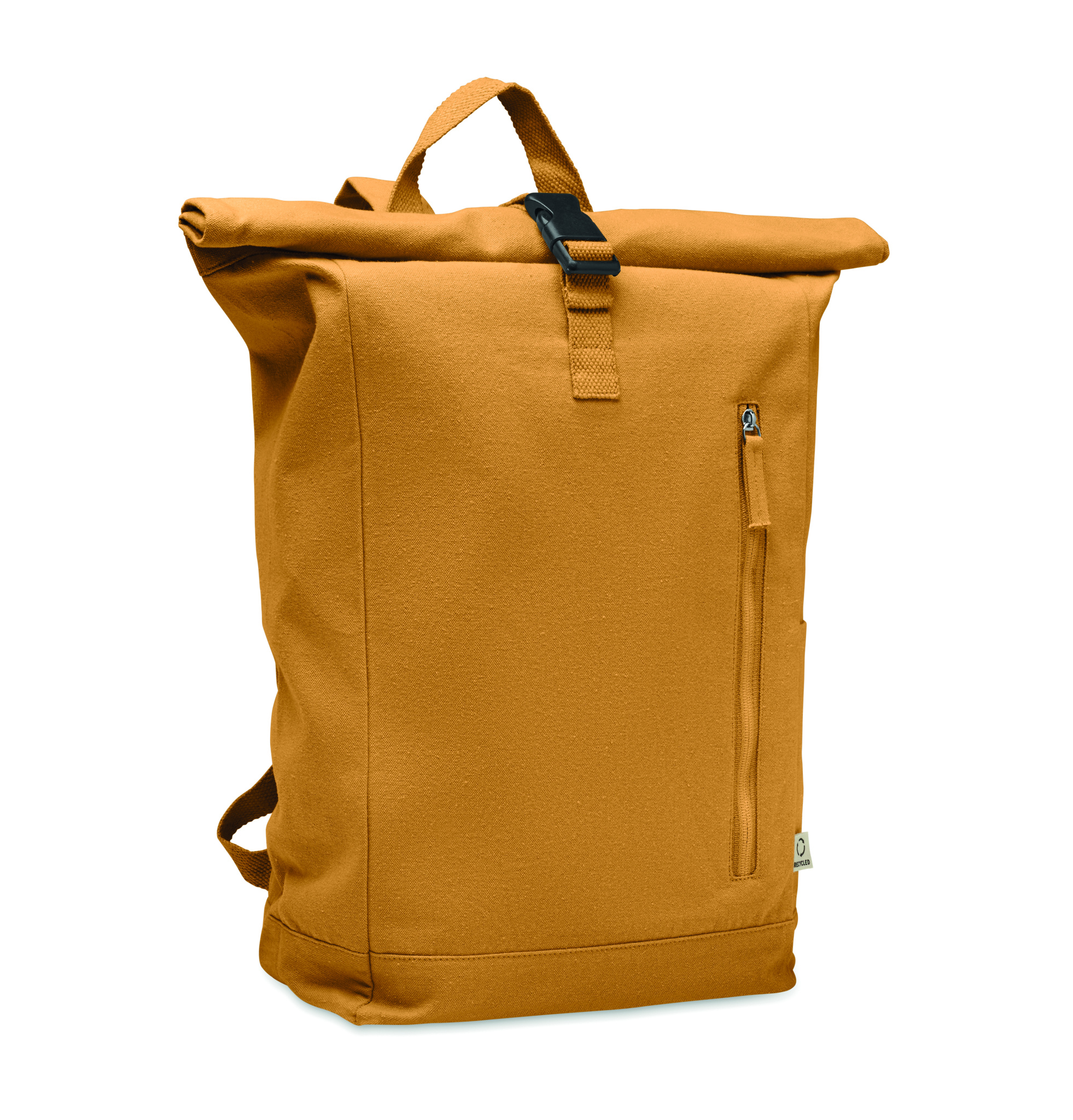 Roll top backpack with hook and loop closure in 390 gr/m² recycled cotton (80%) and recycled polyester (20%). Zippered front pocket.