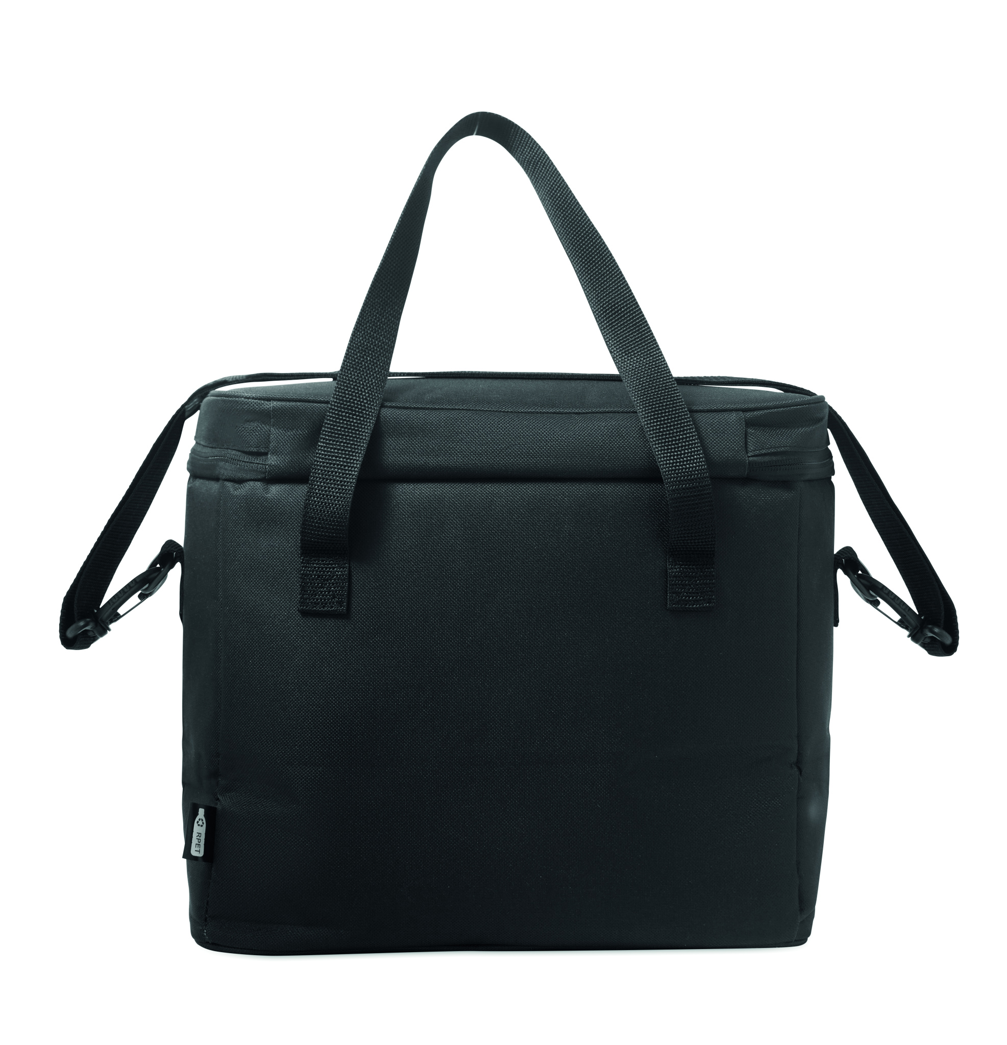 Cooler bag in 600D RPET polyester with PU coating. With 1 front pocket and 1 inner mesh pocket. Isolation PEVA lining with 6mm PE foam. Includes 2 handles and 1 adjustable shoulder strap. Capacity 18L