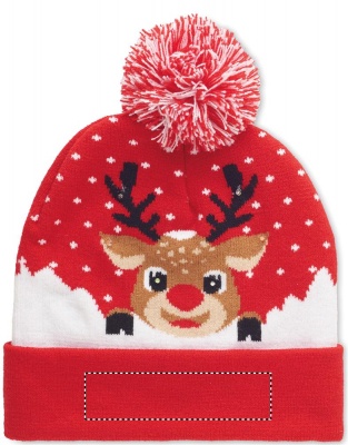 Рождественская вязаная шапка с 6 светодиодными лампочками (3 настройки света), манжетой и помпоном из мягкого акрила. 1 батарейка CR2032 в комплекте.