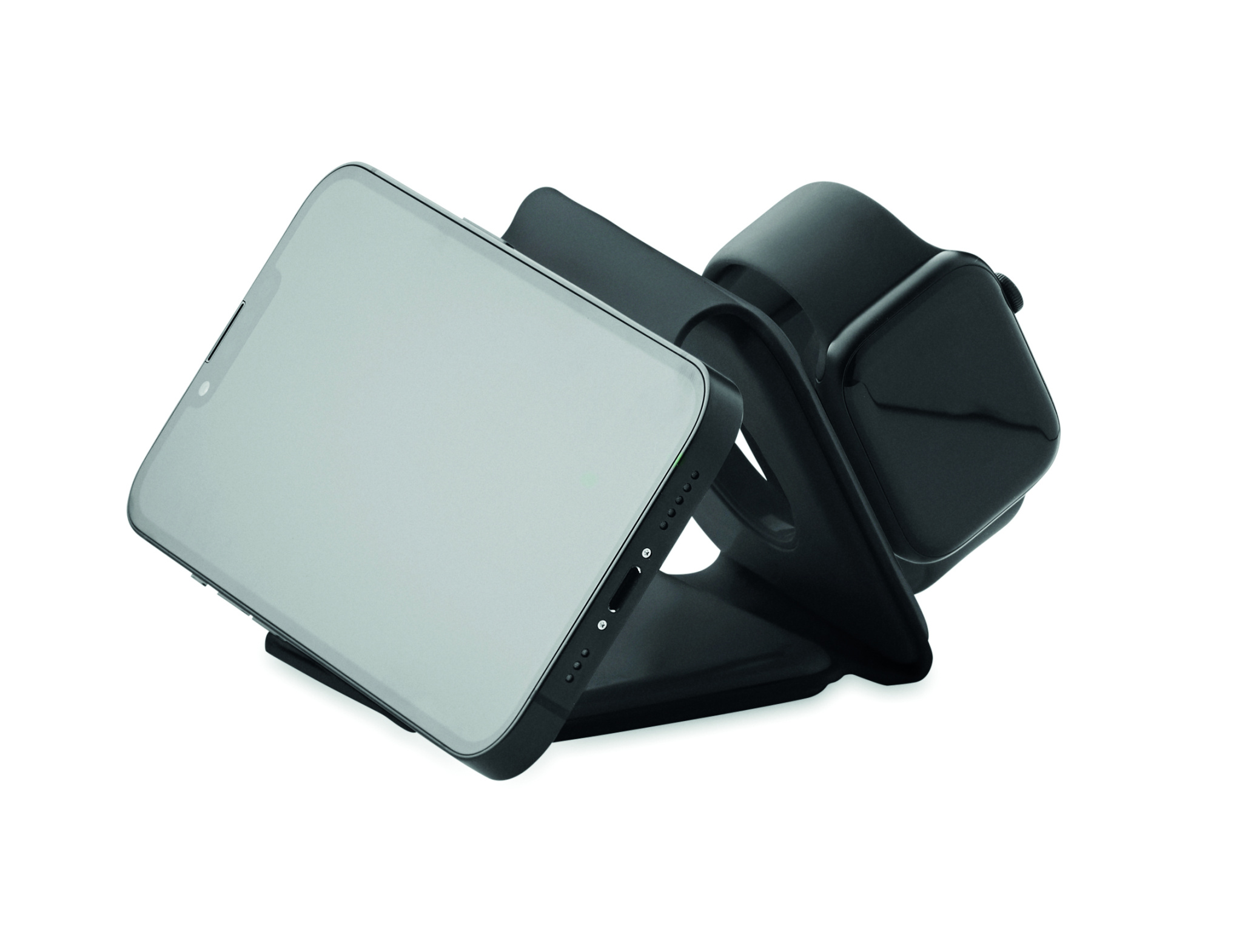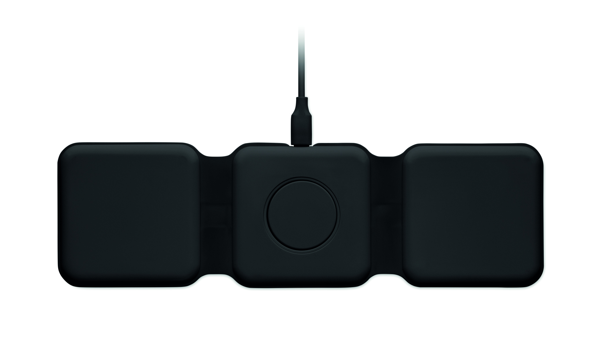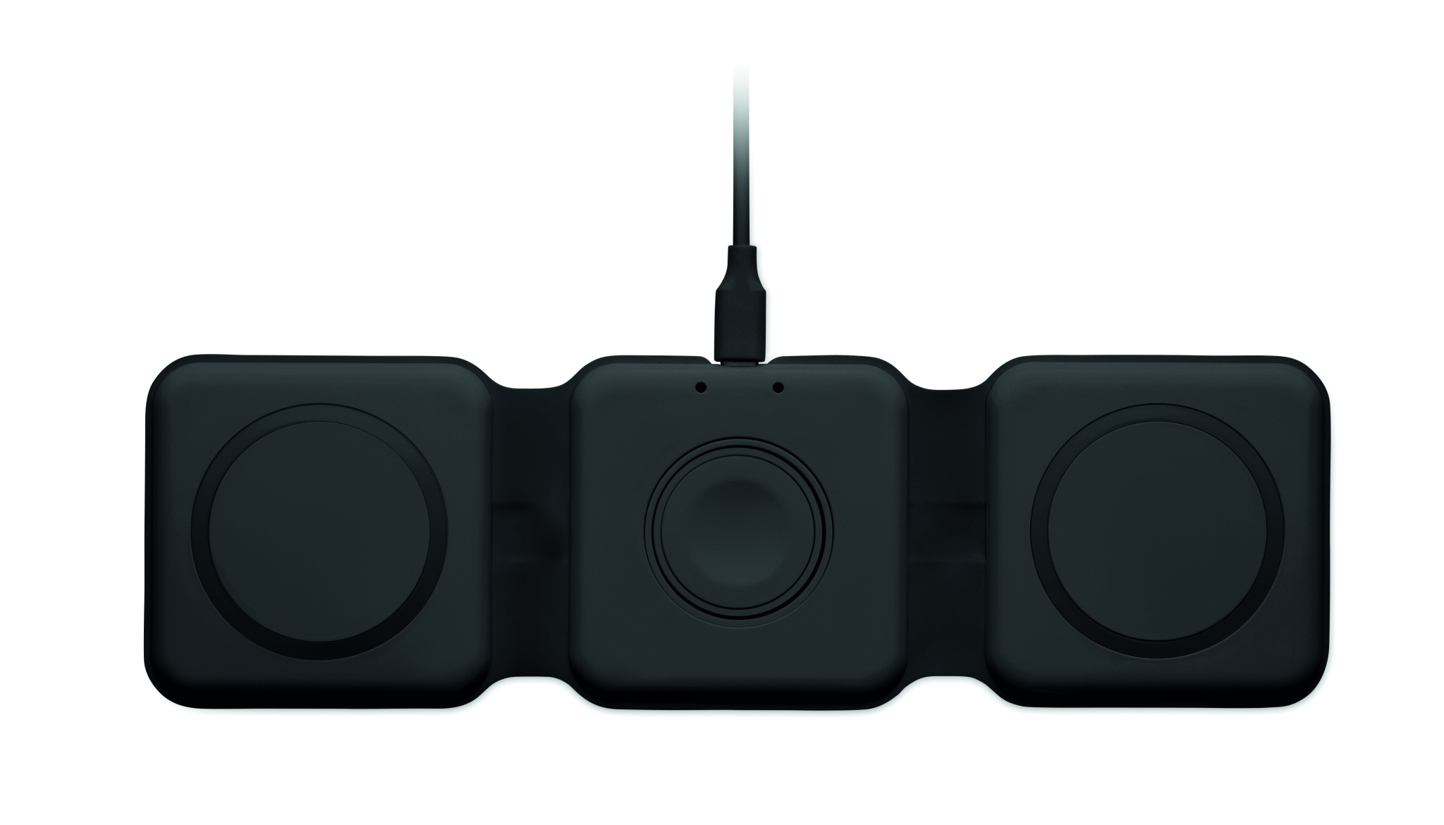 Складная пластиковая зарядная станция 3 в 1. Имеет 3 точки для беспроводной зарядки. Вход: 2-в-1 Type-C и Type-A. Совместима со всеми устройствами с поддержкой QI, такими как последние модели Android, iPhone® 8, X и более новые. Также совместима с часами iWatch.
