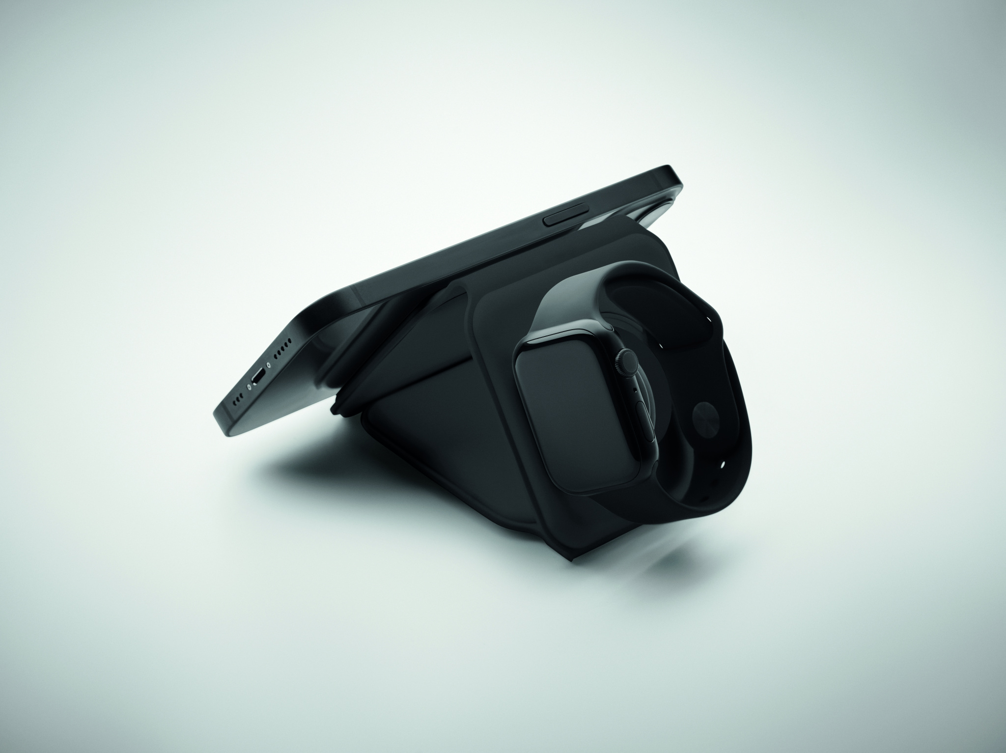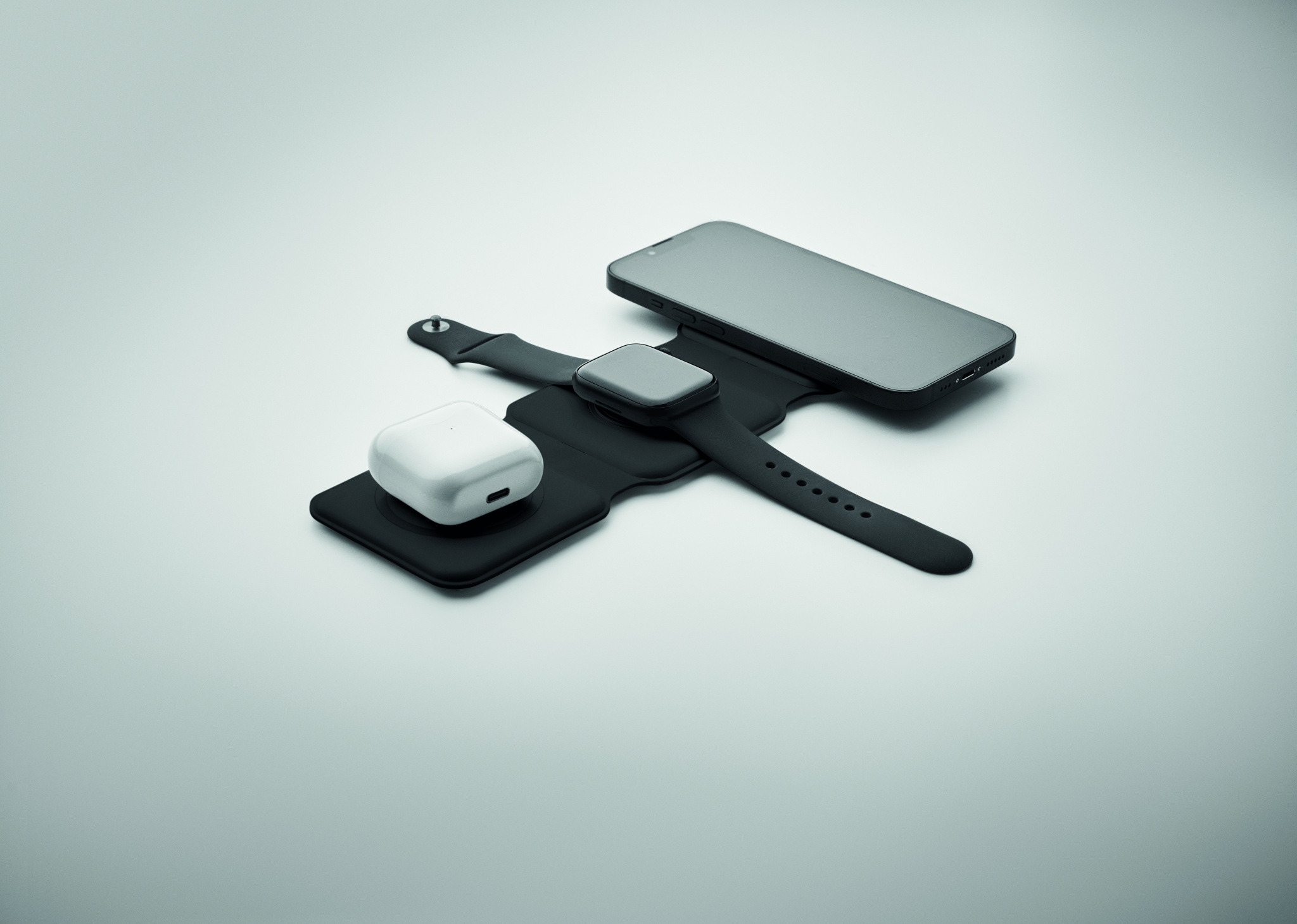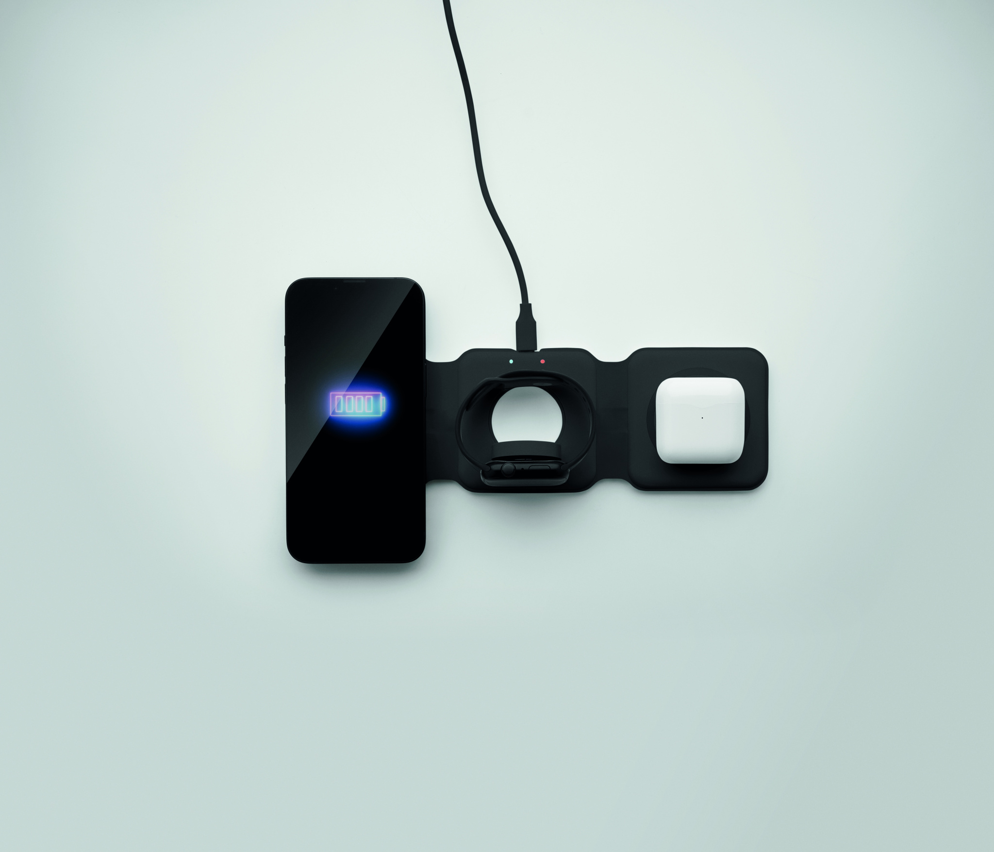 Складная пластиковая зарядная станция 3 в 1. Имеет 3 точки для беспроводной зарядки. Вход: 2-в-1 Type-C и Type-A. Совместима со всеми устройствами с поддержкой QI, такими как последние модели Android, iPhone® 8, X и более новые. Также совместима с часами iWatch.