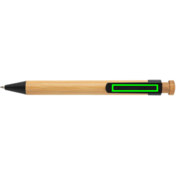 Penna i bambu och vetestrå. Sammansättning av clip är 40% vetestrå och 60% ABS. Med blått Dokumental-bläck och TC-kula för smidig skrivkänsla. Ca 1200m skrift.