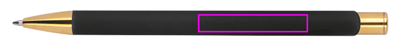 Kulpenna gjord av aluminium med guldapplikationer, gummifinish och blå skrivpåfyllning med stor kapacitet. Din logotyp kommer att laseras på höger sida av klippet, den kommer att visas i guldfärg.