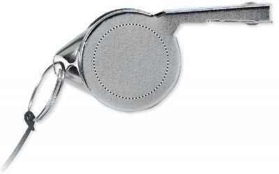 Metall visselpipa fäst vid snodd med säkerhetsspänne.