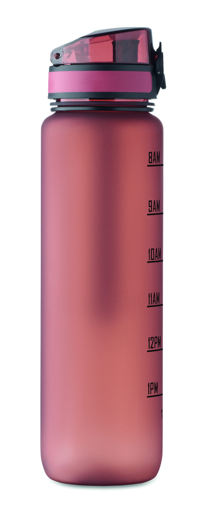 Sportvattenflaska i RPET med tidsmarkeringar, flip lock som kan öppnas med en hand, säkerhetslås och bärrem. Läckagefri. Volym: 1L.
