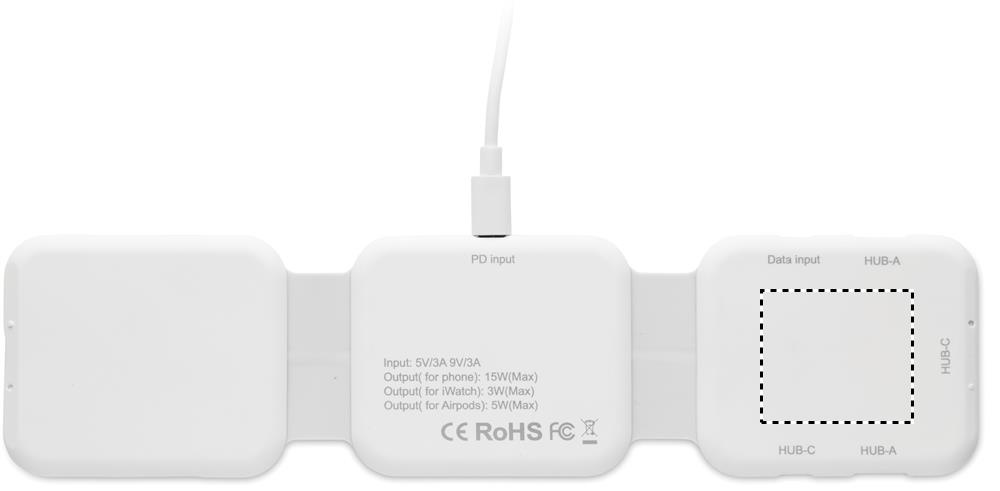 Magnetisk laddningsstation i ABS. 3 platser för trådlös laddning. 1 x 15W, 1 x 5W för TWS och 1 Apple watch-laddare (3W). 2 Typ-C & 2 USB-A HUBS. Integrerad kabelingång: kontakt från typ C till USB-A.